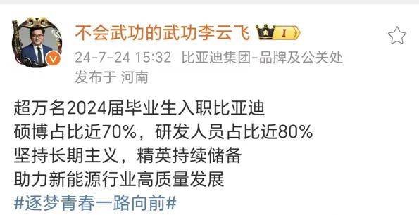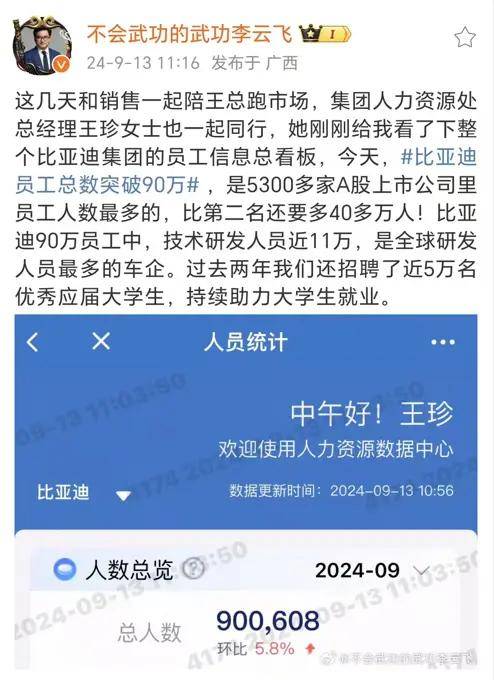 在新能源汽车的风口之下,比亚迪正以惊人之势蓬勃发展。9月13日消息,比亚迪集团品牌及公关处总经理李云飞在其个人微博上透露,比亚迪员工总数突破 90 万,是5300多家A股上市公司里员工人数最多的,比第二名还要多40多万人,过去两年,比亚迪招聘了近5万名优秀应届大学生,持续助力大学生就业。